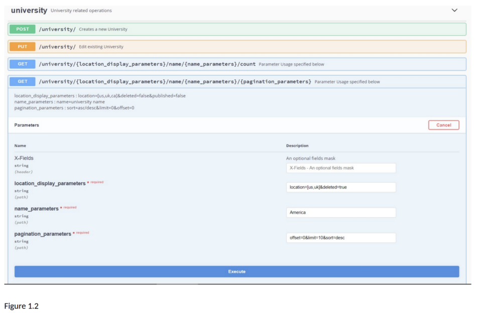 In Figure 1.2, the GET API for “university” expects different parameters. Swagger UI simplifies this by displaying input boxes where you can enter parameters directly. It also allows you to define which parameters are valid.